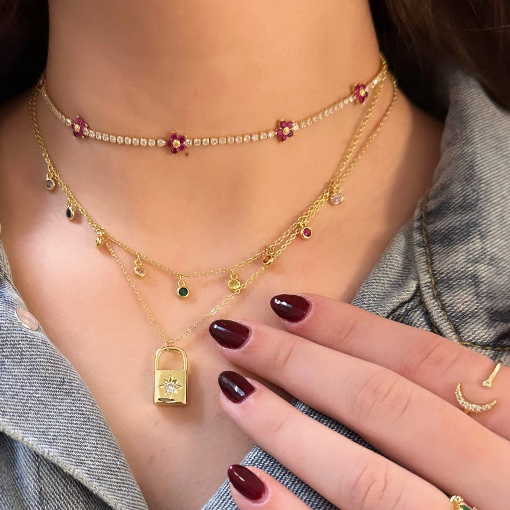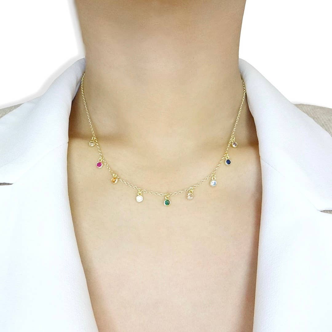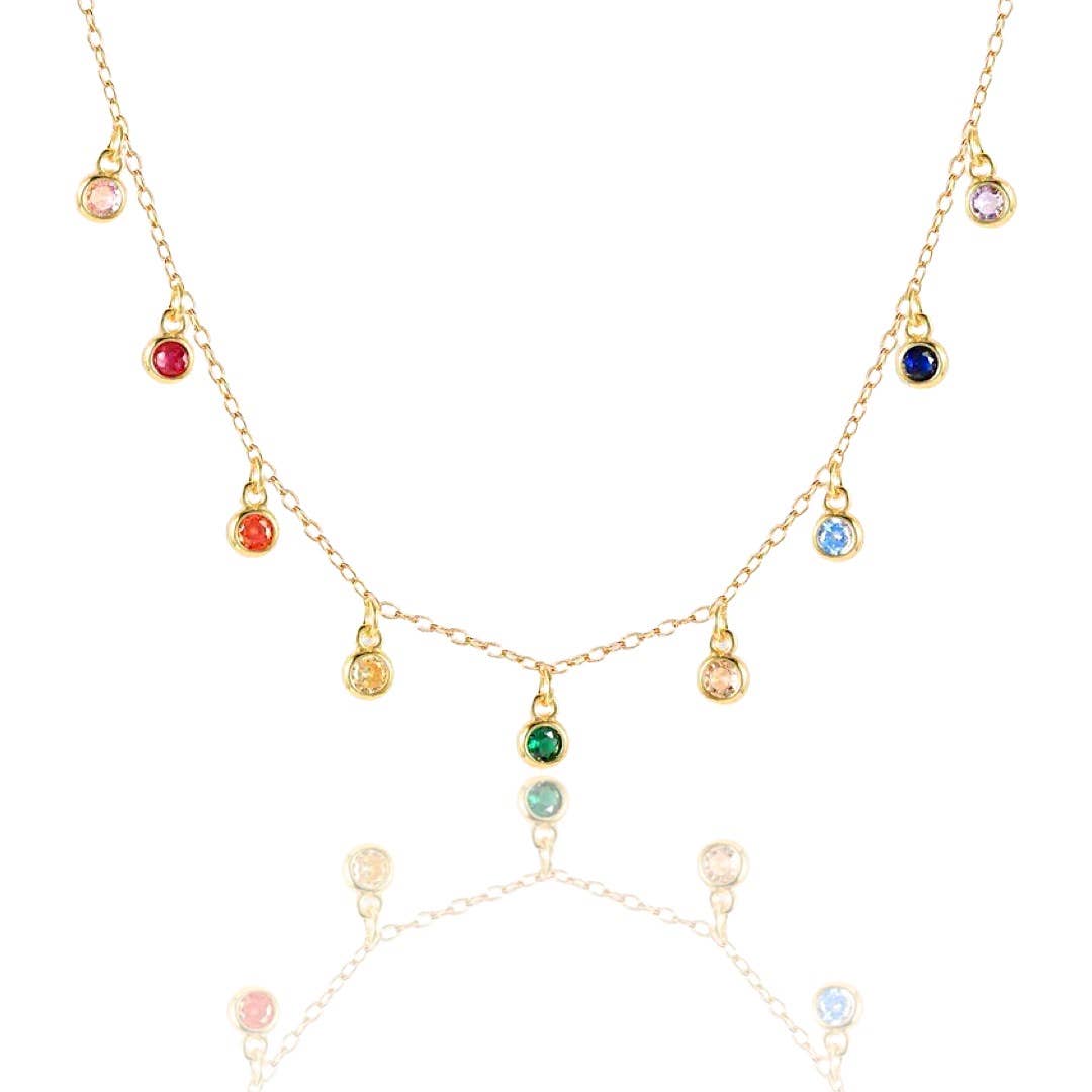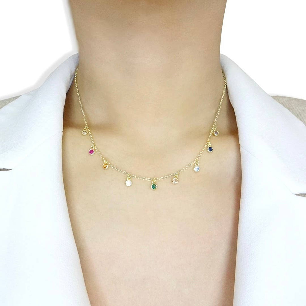 Accentuate your dazzling charisma with this shiny dangling gold rainbow choker necklace design. Created to elegantly lay against your neck, its striking rainbow design will draw attention to your neckline and complete your look in a spectacular fashion. Individual stones are carefully hand-set to assure the highest level of quality jewelry. Brilliance and sparkle like a real diamond. More Details: - Carefully Handmade - Sterling Silver (925) - Cubic Zirconia Rainbow - Length: 15" + 2" Ext. - E-Coating Protection (Anti-Tarnish) - Metal Color: 18k Gold